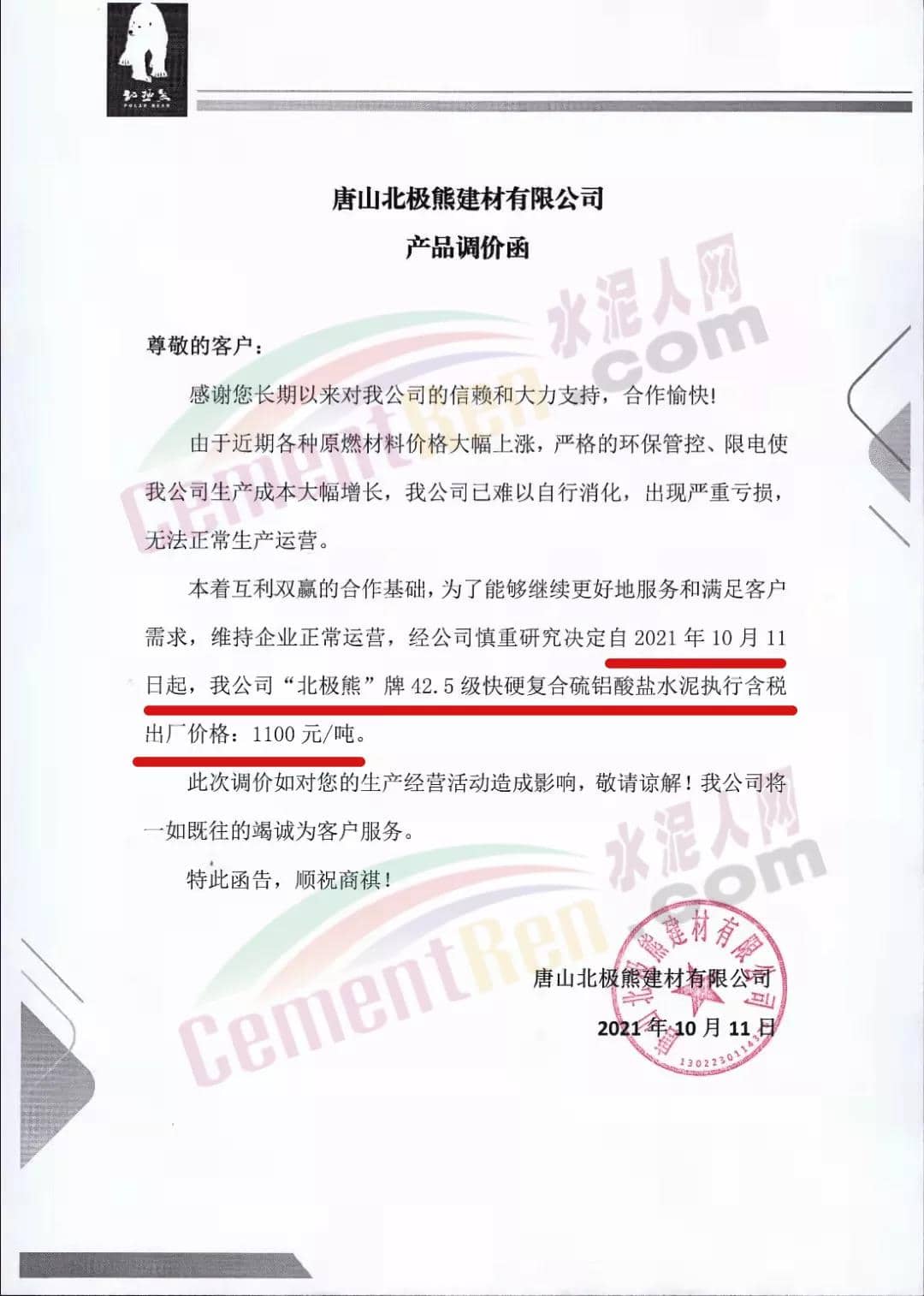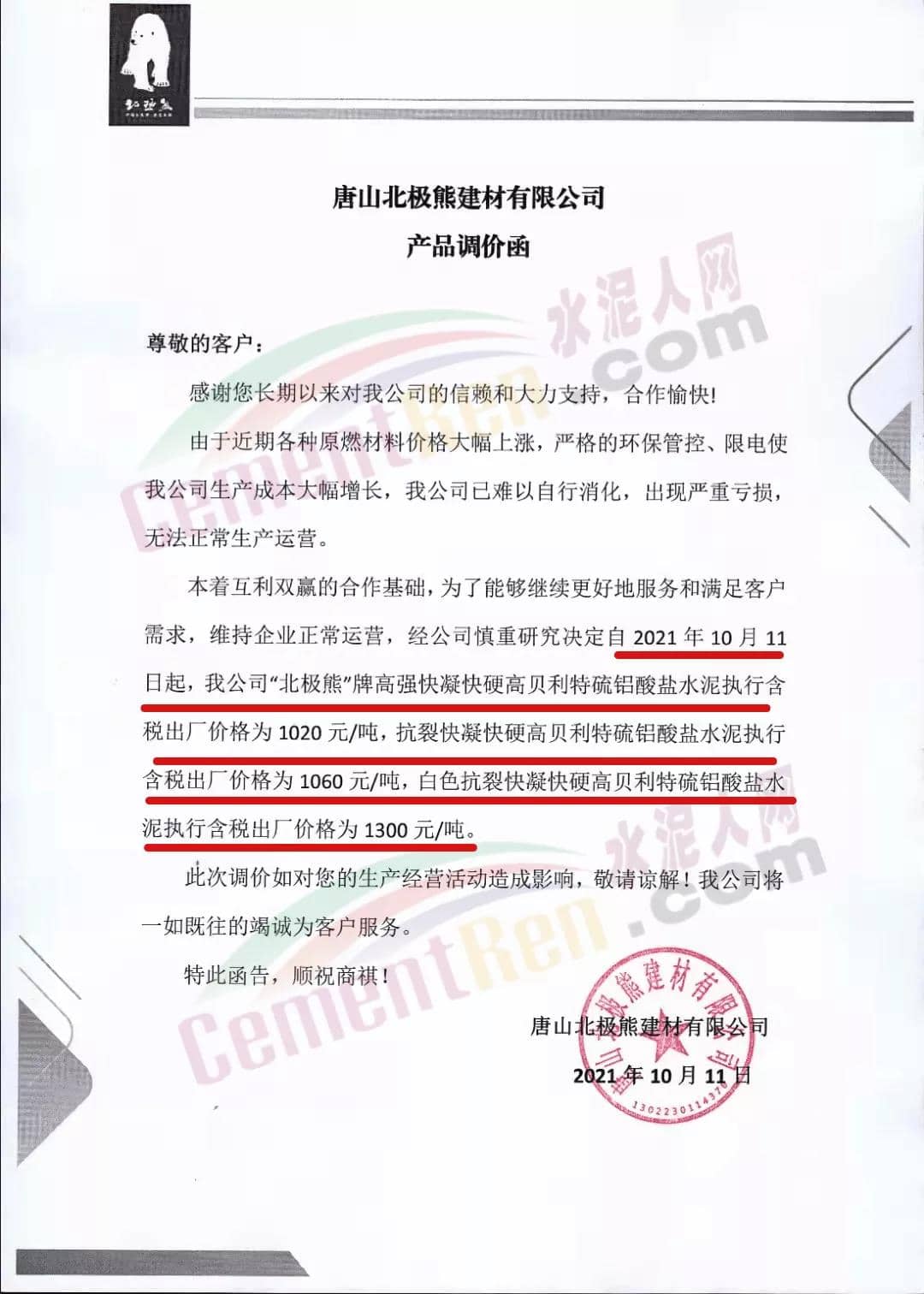 10月11日唐山北極熊建材有限公司發(fā)布通知稱:本著互利雙贏的合作基礎(chǔ),為了能夠繼續(xù)更好地服務(wù)和滿足客戶需求,維持企業(yè)正常運營,經(jīng)公司慎重研究決定自2021年10月11日起,調(diào)整產(chǎn)品價格。調(diào)價后旗下“北極熊”品牌水泥價格最高達(dá)1300元/噸。