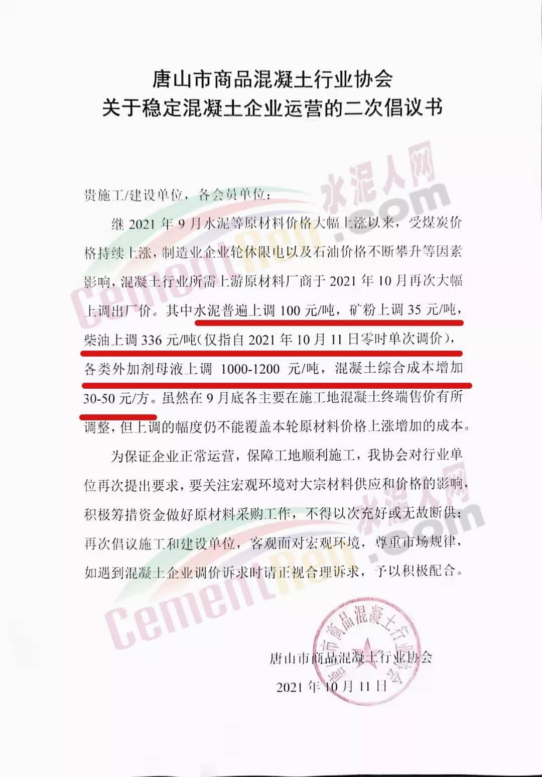 同日,唐山市商品混凝土行業(yè)協(xié)會發(fā)布《關(guān)于穩(wěn)定混凝土企業(yè)運營的二次倡議書》給各施工/建設(shè)單位及會員單位稱,繼2021年9月水泥等原材料價格大幅上漲以來,受煤炭價格持續(xù)上漲,制造業(yè)企業(yè)輪休限電以及石油價格不斷攀升等因素影響,混凝土行業(yè)所需上游原材料廠商于2021年10月再次大幅上調(diào)出廠價。其中水泥普遍上調(diào)100元/噸,礦粉上調(diào)35元/噸,柴油上調(diào)336元/噸(僅指自2021年10月11日零時單次調(diào)價),各類外加劑母液上調(diào)1000-1200元/噸,混凝土綜合成本增加30-50元/方。雖然在9月底各主要在施工地混凝土終端售價有所調(diào)整,但上調(diào)的幅度仍不能覆蓋本輪原材料價格上漲增加的成本。