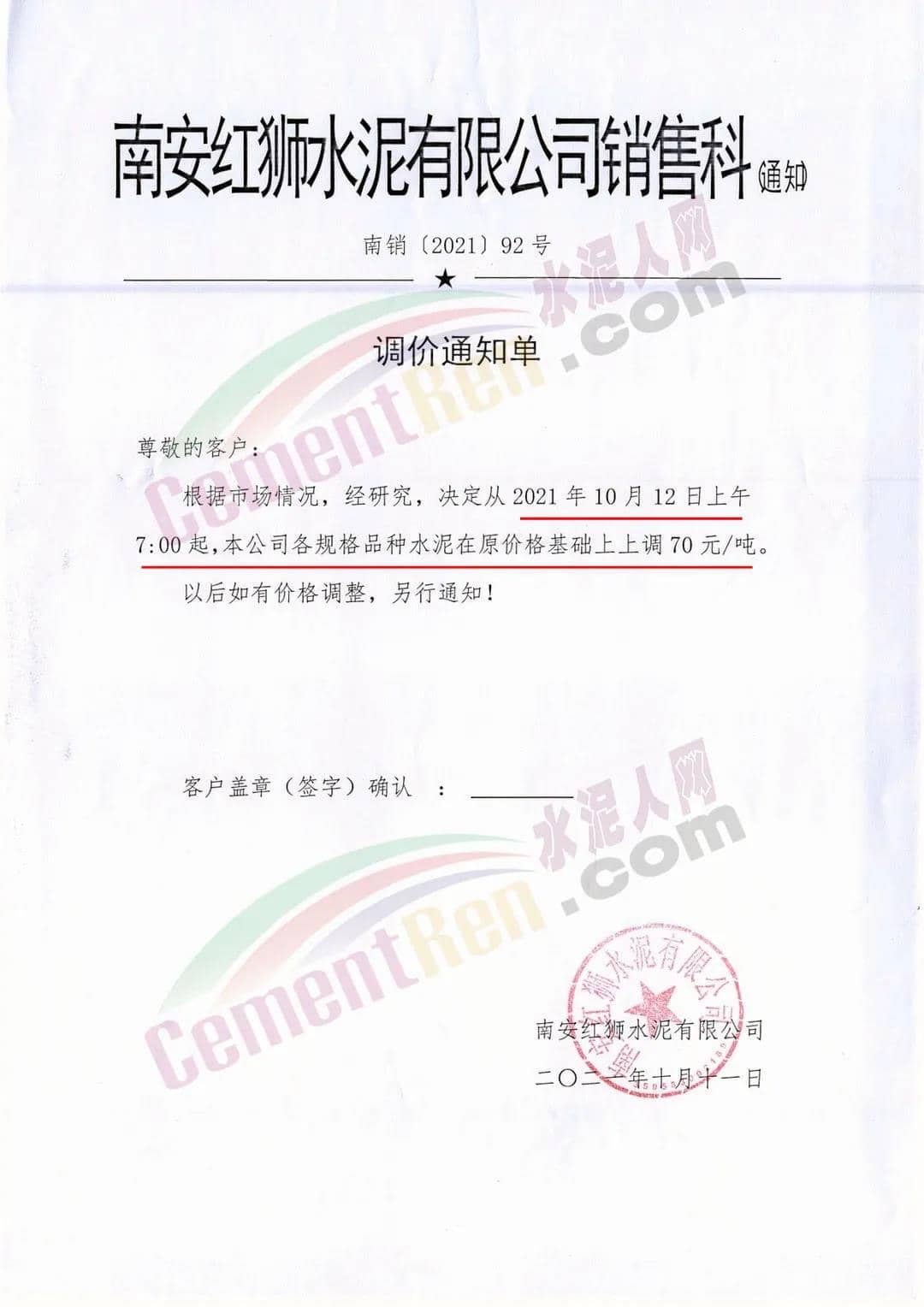 福建泉州南安紅師水泥有限公司銷售科通知,根據(jù)市場情況,經(jīng)研究決定從2021年10月12日上午7時起,各規(guī)格品種水泥在原價格基礎(chǔ)上上調(diào)70元/噸。