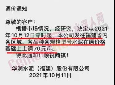 華潤水泥(福建)股份有限公司通知根據(jù)市場情況,經(jīng)研究決定從2021年10月12日零時起,發(fā)往福建省內(nèi)各區(qū)域,各品種各規(guī)格型號水泥在原價格基礎(chǔ)上上調(diào)70元/噸。