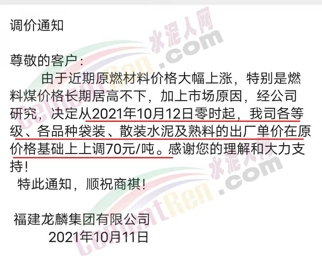 福建龍麟集團(tuán)有限公司通知,由于近期原燃材料價格大幅上漲,特別是燃料煤價格長期居高不下,加上市場原因,經(jīng)公司研究,決定從2021年10月12日零時起,公司各等級、各品種袋裝、散裝水泥及熟料的出廠單價在原價格基礎(chǔ)上上調(diào)70元/噸。