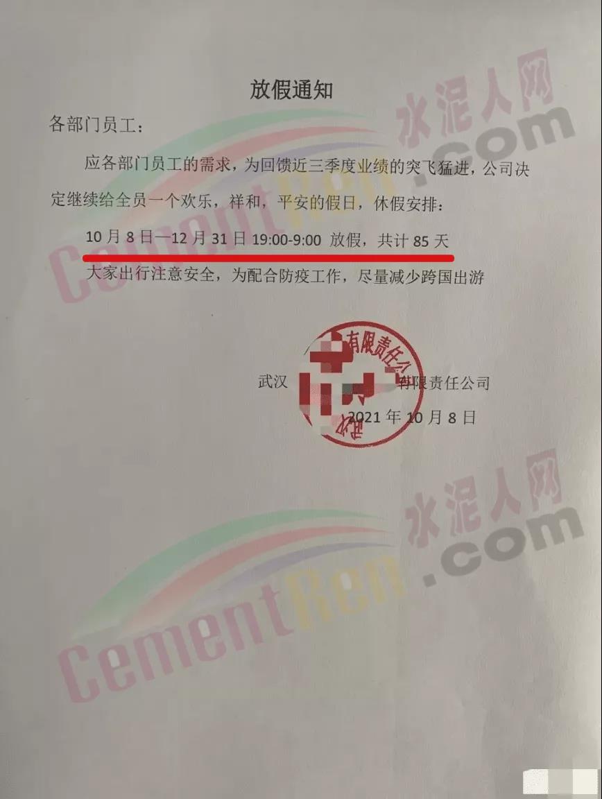 近日,湖北武漢某企業(yè)發(fā)布放假通知,稱應(yīng)各部門員工的需求,為回饋近三季度業(yè)績(jī)的突飛猛進(jìn),決定繼續(xù)給全員一個(gè)歡樂(lè),祥和,平安的假日,休假安排:10月8日一12月31日19:00-9:00放假,共計(jì)85天。