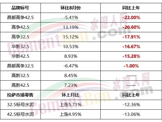 據(jù)西藏自治區(qū)發(fā)改委公開數(shù)據(jù)顯示,9月份水泥非重點項目出廠價格與上年同期相比跌幅最高達到22%。42.5標(biāo)號水泥拉薩市場平均零售價下跌13.06%。