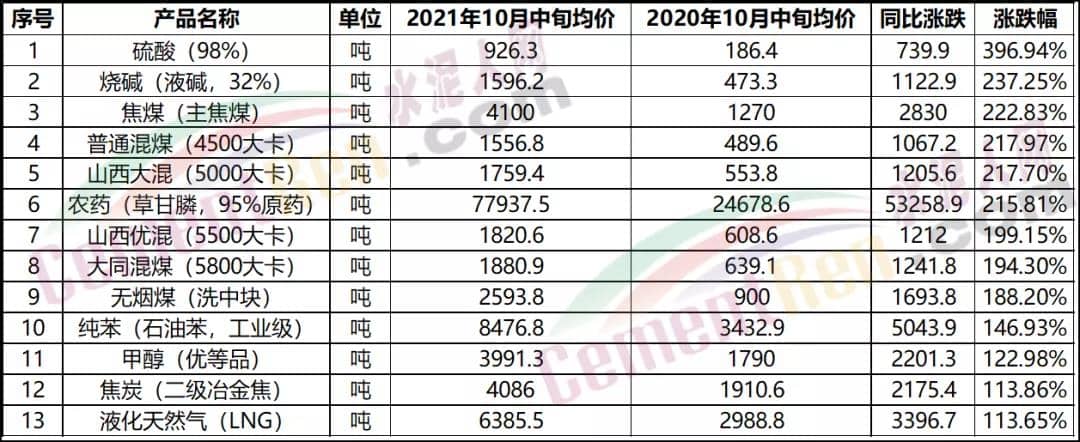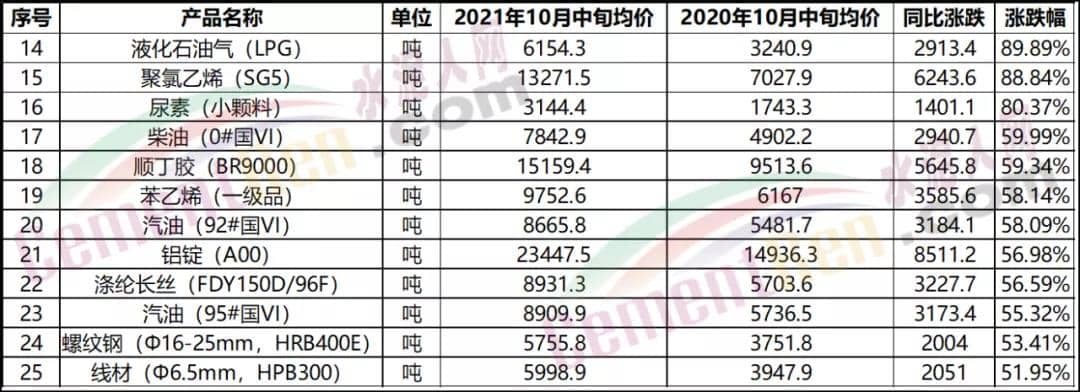 據(jù)國(guó)家統(tǒng)計(jì)局官網(wǎng)公布的全國(guó)流通領(lǐng)域9大類50種重要生產(chǎn)資料市場(chǎng)價(jià)格的監(jiān)測(cè)數(shù)據(jù)顯示,2021年10月中旬同比2020年10月中旬47種產(chǎn)品價(jià)格上漲,3種下降。其中13種產(chǎn)品漲幅在100%以上,12種產(chǎn)品漲幅在50%~90%之間。
