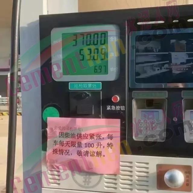 從圖片中可以看出,在加油站油箱上,醒目的貼上“因柴油價(jià)格供應(yīng)緊張,每車每天限量100升,特殊情況,敬請(qǐng)諒解”。