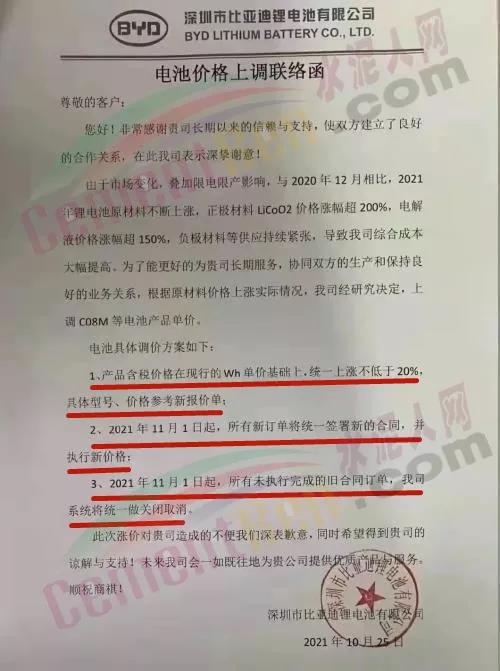 近日比亞迪發(fā)布通知稱,由于市場(chǎng)變化、疊加限電限產(chǎn)影響,與2020年12月相比,2021年鋰電池原材料不斷上漲,正極材料LiCoO2價(jià)格漲幅超200%,電解液價(jià)格漲幅超150%,負(fù)極材料等供應(yīng)持續(xù)緊張,導(dǎo)致綜合成本大幅提高。根據(jù)原材料價(jià)格上漲實(shí)際情況,深圳市比亞迪鋰電池有限公司經(jīng)研究決定,上調(diào)CO8M等電池產(chǎn)品單價(jià)。