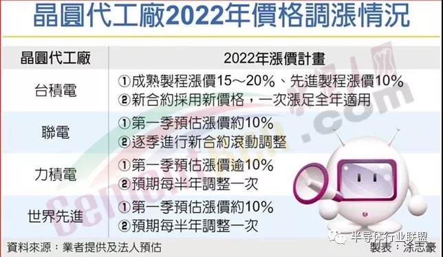 代工產(chǎn)能供應(yīng)荒或?qū)⒊掷m(xù)至2022年,繼臺(tái)積電后,聯(lián)電、力積電、世界先進(jìn)等,據(jù)稱近期已陸續(xù)通知客戶明年第一季度再度漲價(jià)超10%,且強(qiáng)調(diào)上半年產(chǎn)能已全部預(yù)訂完畢,訂單能見(jiàn)度看至下半年。據(jù)臺(tái)媒報(bào)道,根據(jù)業(yè)內(nèi)預(yù)估,臺(tái)積電方面明年漲幅在10%-20%之間,價(jià)格全年適用,聯(lián)電、力積電、世界先進(jìn)明年第一季度漲價(jià)均超10%,但此后均可能再調(diào)整,其中聯(lián)電逐季滾動(dòng)調(diào)整,力積電、世界先進(jìn)均為每半年調(diào)整一次。