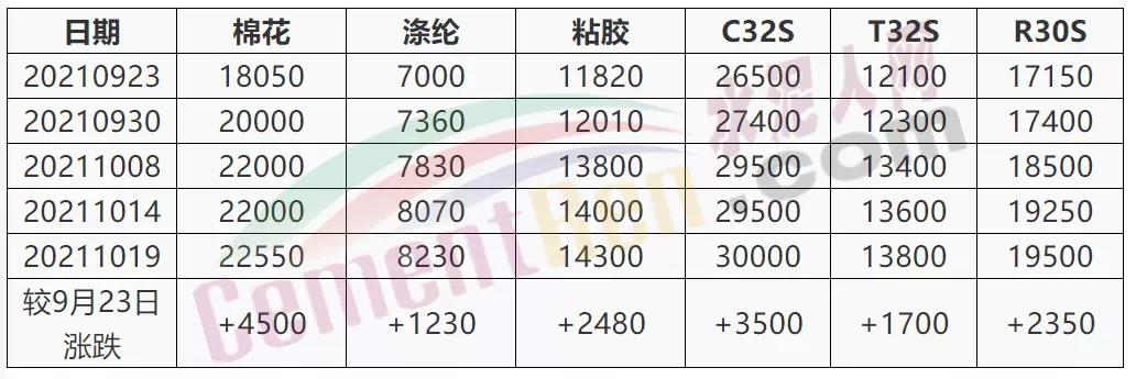 截止10月21日,三大棉紡原料較9月23日分別上漲了4500元/噸、1230元/噸、2480元/噸。