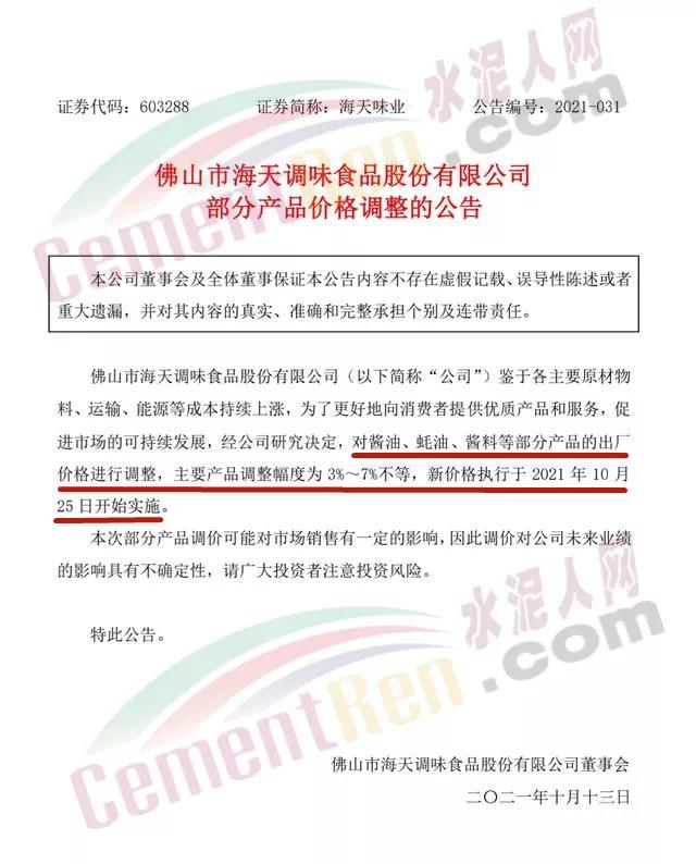 10月12日,海天味業(yè)發(fā)布部分產(chǎn)品價(jià)格調(diào)整公告,公告稱對(duì)醬油、蠔油、醬料等部分產(chǎn)品的出廠價(jià)格進(jìn)行調(diào)整,調(diào)整幅度為3%~7%不等,新價(jià)格執(zhí)行于2021年10月25日開(kāi)始實(shí)施。