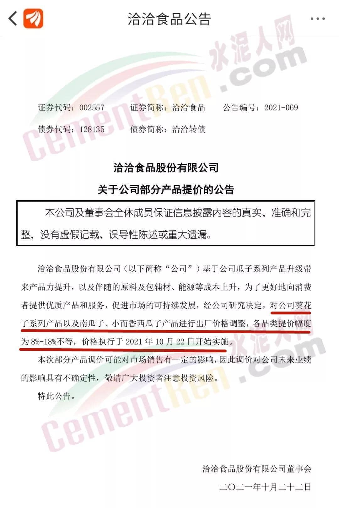 洽洽食品公告截圖