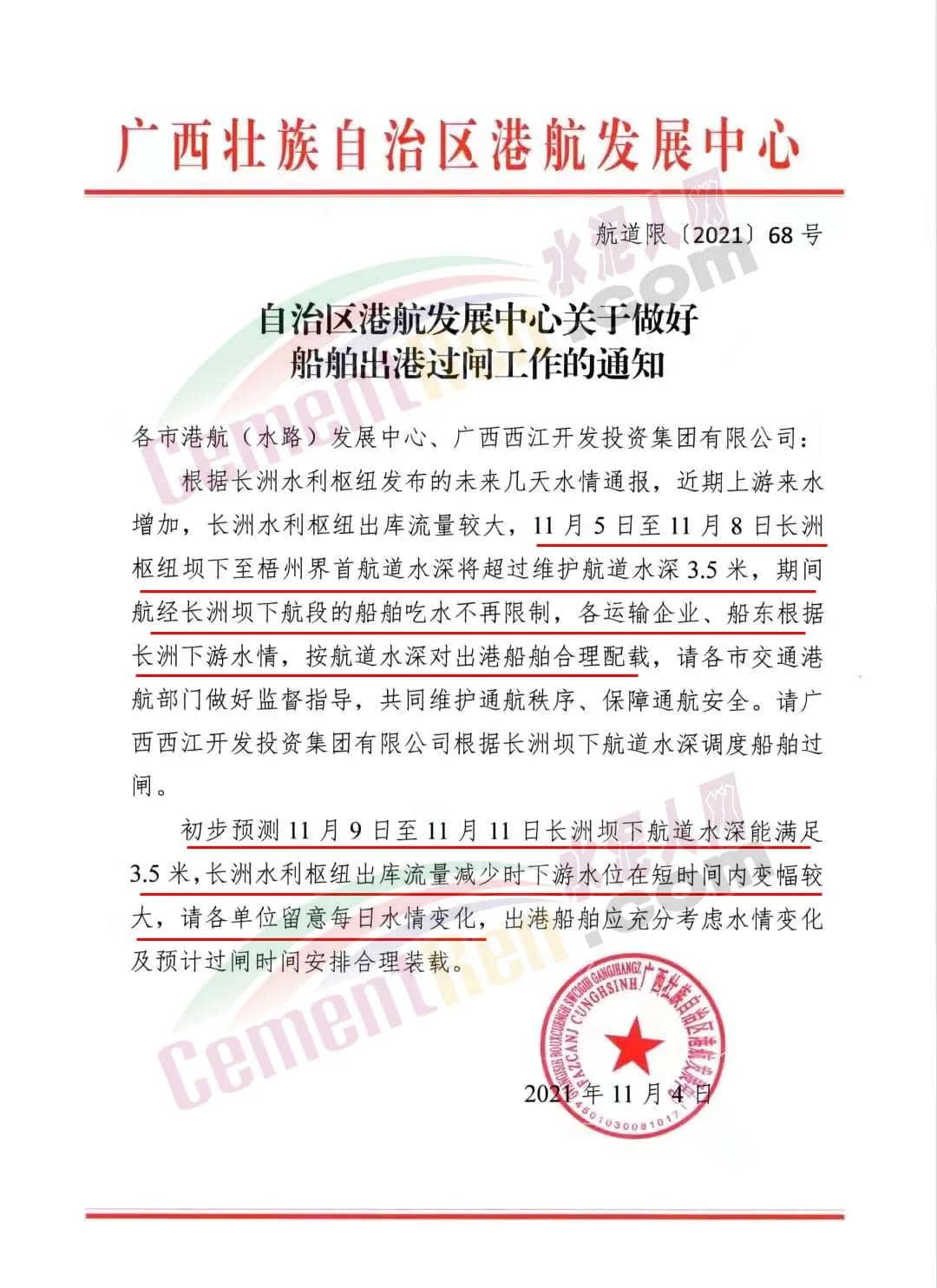 11月4日,廣西壯族自治區(qū)港航發(fā)展中心發(fā)布《自治區(qū)港航發(fā)展中心關于做好船舶出港過閘工作的通知》給各市港航(水路)發(fā)展中心、廣西西江開發(fā)投資集團有限公司稱,根據(jù)長洲水利樞紐發(fā)布的未來幾天水情通報,近期上游來水增加,長洲水利樞紐出庫流量較大,11月5日至11月8日長洲樞紐壩下至梧州界首航道水深將超過維護航道水深3.5米,期間航經(jīng)長洲壩下航段的船舶吃水不再限制,各運輸企業(yè)、船東根據(jù)長洲下游水情,按航道水深對出港船舶合理配載。
