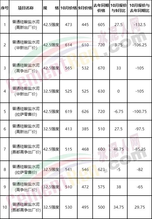 據(jù)10月末西藏發(fā)改委公布數(shù)據(jù),高新、華新、高爭等多家企業(yè)32.5和42.5強度水泥與去年同期相比出現(xiàn)不同程度的下跌。其中,普通硅酸鹽水泥出廠價10月份報價較去年同期下跌相對較大。其中42.5強度高新跌132.5元/噸,華新下跌106.25元/噸,高爭下跌105元/噸;32.5強度,華新下跌105元/噸;拉薩地區(qū)42.5強度零售價下跌100.75元/噸。