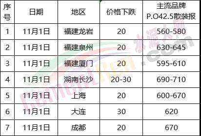 11月4日廣東省部分區(qū)域水泥價格漲跌一覽