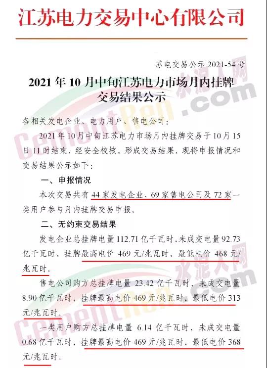 江蘇省10月中旬月內(nèi)掛牌交易,共成交電量19.98億千瓦時,成交均價468.97元/兆瓦時,成交價較基準價上浮了19.94%。