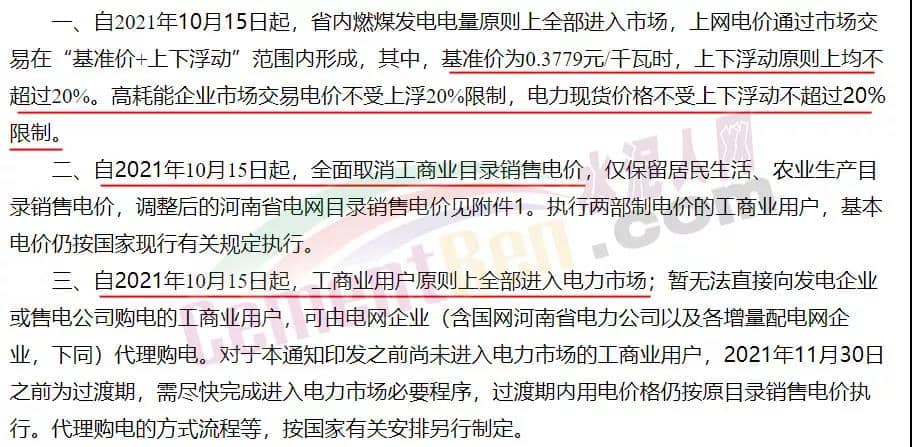 河南省內(nèi)燃煤發(fā)電電量原則上全部進入市場,上網(wǎng)電價通過市場交易在“基準價+上下浮動”范圍內(nèi)形成,其中,基準價為0.3779元/千瓦時,上下浮動原則上均不超過20%。高耗能企業(yè)市場交易電價不受上浮20%限制,電力現(xiàn)貨價格不受上下浮動不超過20%限制。自2021年10月15日起,全面取消工商業(yè)目錄銷售電價,僅保留居民生活、農(nóng)業(yè)生產(chǎn)目錄銷售電價。自2021年10月15日起,工商業(yè)用戶原則上全部進入電力市場。