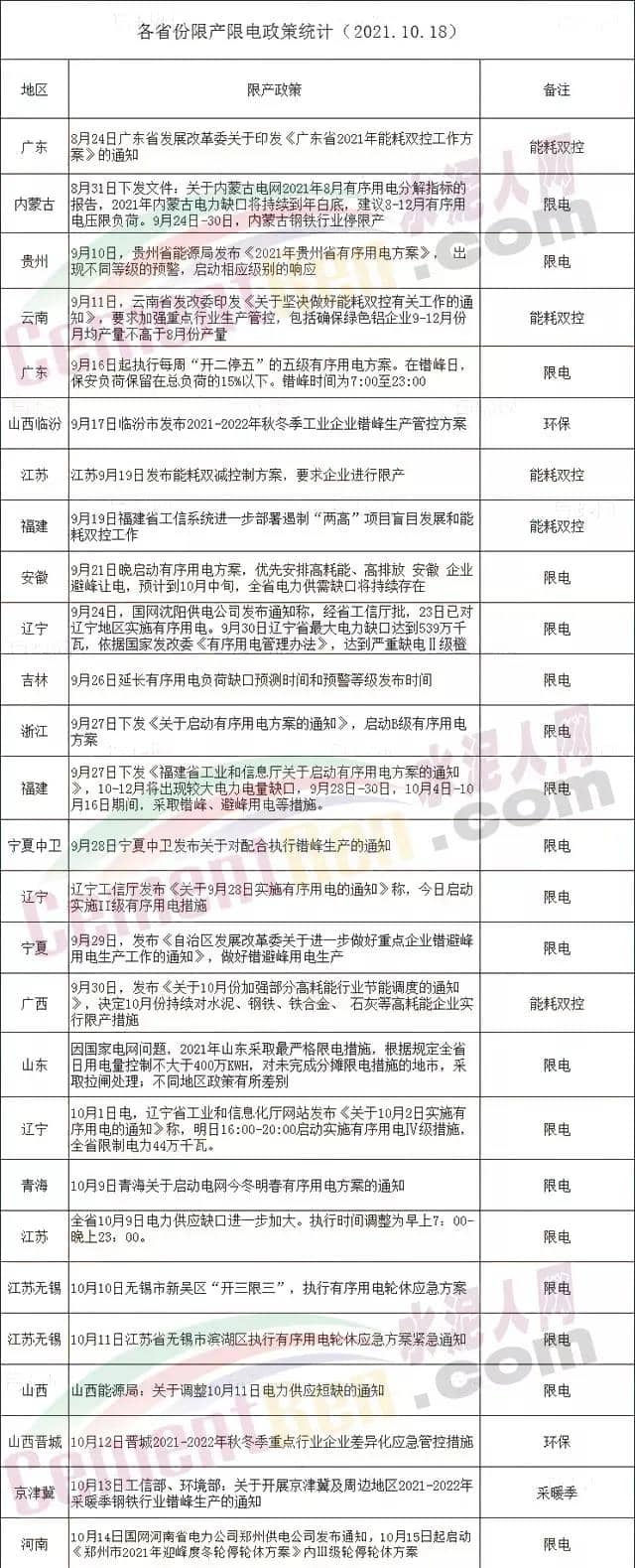 11月3日,安徽省發(fā)布《“兩高”重點企業(yè)2021年內(nèi)用能(電)管控計劃》要求相關(guān)主管部門做好超計劃用能(電)企業(yè)限電工作。文件附件各市“兩高”重點企業(yè)名單中包括海螺水泥、南方水泥、中材水泥、天瑞水泥、上峰水泥、磊達水泥等近百家水泥及混凝土生產(chǎn)企業(yè)。存量“兩高”問題項目梳理排查表中包含海螺水泥、南方水泥、鐵鵬水泥、眾城水泥等多個項目。