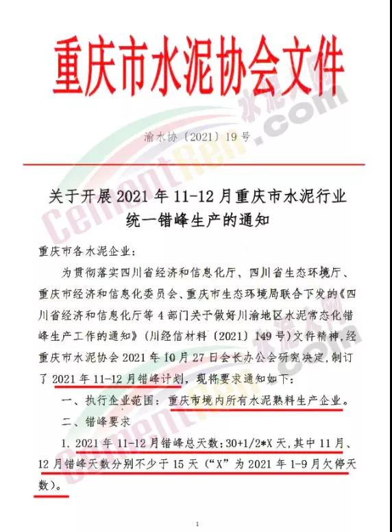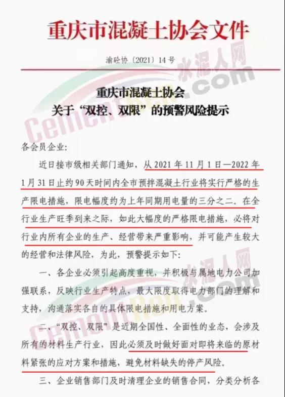 綜上所述,各地針對于高耗能企業(yè)的電價控制以及限電、限產(chǎn)要求加嚴,此前重慶市混凝土協(xié)會發(fā)布《關(guān)于“雙控、雙限”的預(yù)警風(fēng)險提示》要求從 2021年11月1日~2022年1月31日止約90天時間內(nèi)全市預(yù)拌混凝土行業(yè)將實行嚴格的生產(chǎn)限電措施,限電幅度約為上年同期用電量的三分之二。同期,重慶市水泥協(xié)會發(fā)文要求轄區(qū)水泥企業(yè)自11月1日起執(zhí)行錯峰生產(chǎn)。水泥成本增加同時供應(yīng)量減少,水泥價格應(yīng)聲上漲100-150元/噸。但因下游商混企業(yè)同樣面臨限電限產(chǎn),水泥價格提漲落實情況不理想。