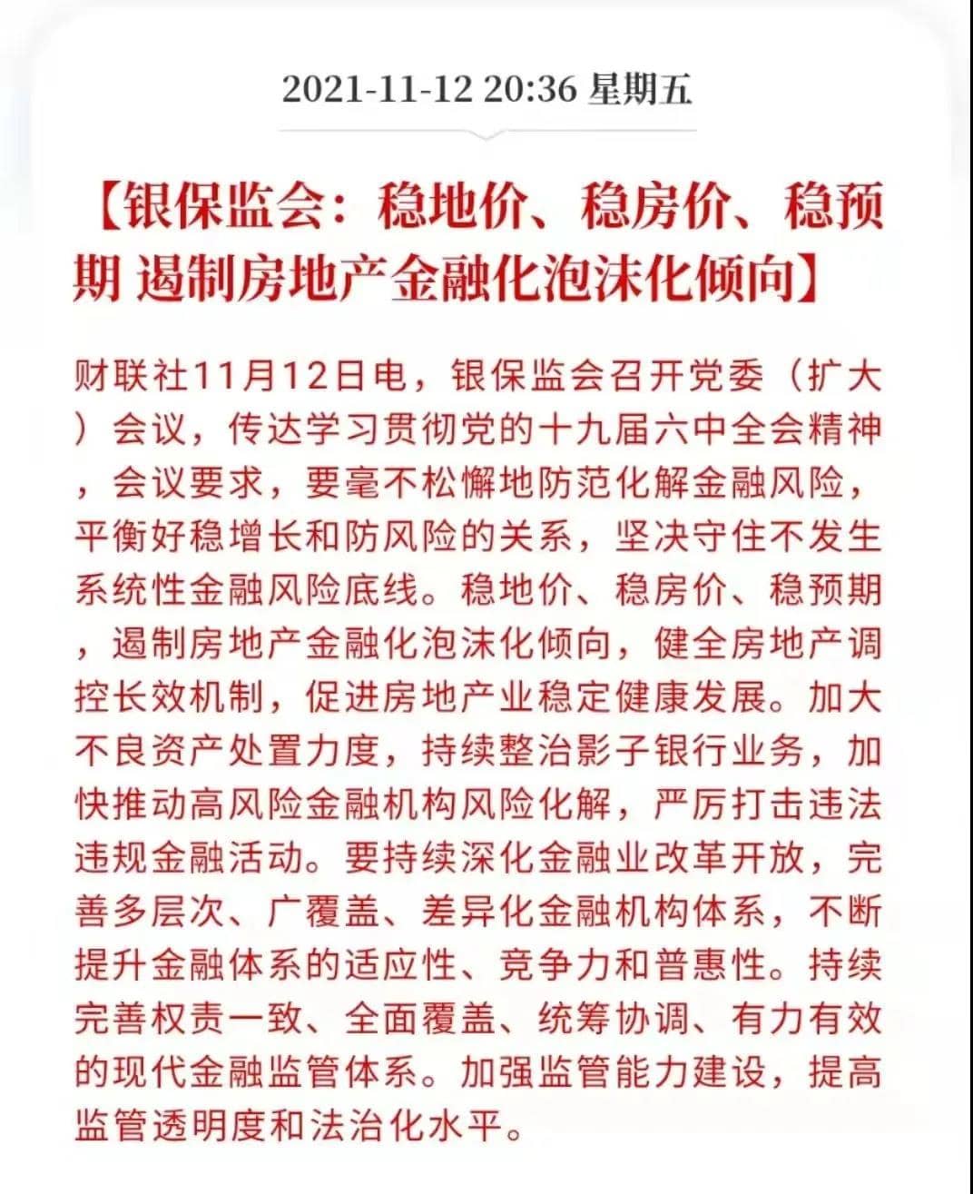 而后,央行發(fā)聲,堅決遏制金融服務業(yè)領域的壟斷和資本無序擴張,維護房地產(chǎn)市場平穩(wěn)健康發(fā)展。銀保監(jiān)會同步發(fā)聲表示,穩(wěn)地價、穩(wěn)房價、穩(wěn)預期,遏制房地產(chǎn)金融化泡沫化傾向,健全房地產(chǎn)調控長效機制,促進房地產(chǎn)業(yè)穩(wěn)定健康發(fā)展。