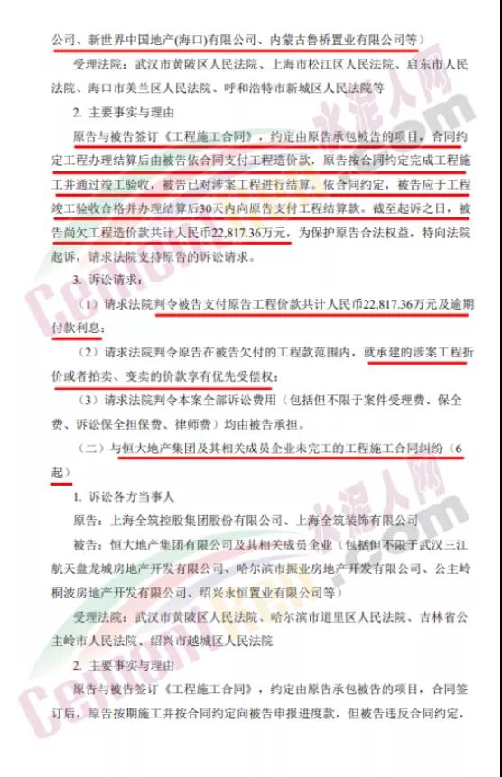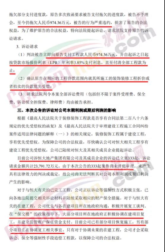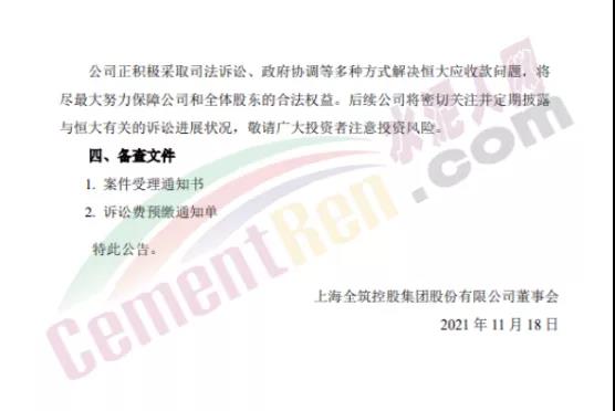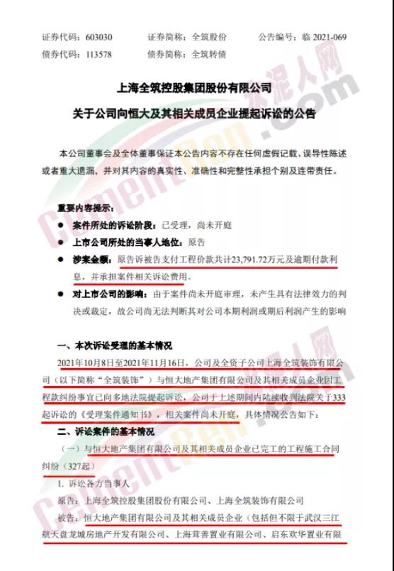 11月17日晚間,全筑股份公告稱,公司及全資子公司全筑裝飾與恒大地產(chǎn)集團(tuán)及其相關(guān)成員企業(yè)因工程款糾紛事宜已向多地法院提起訴訟。全筑股份訴恒大方面支付工程價款共計(jì)2.38億元及逾期付款利息,并承擔(dān)案件相關(guān)訴訟費(fèi)用。全筑股份表示,正積極采取司法訴訟、政府協(xié)調(diào)等多種方式解決恒大應(yīng)收款問題。