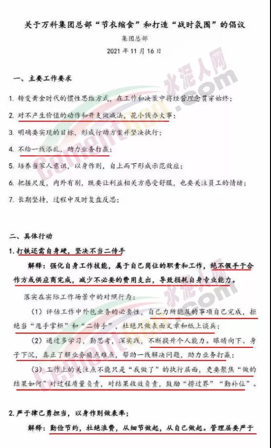 同期,萬科總部下發(fā)了一份主題為《關(guān)于萬科集團(tuán)總部“節(jié)衣縮食”和打造“戰(zhàn)時氛圍”的倡議》,共提出7點(diǎn)工作要求兩條具體行動。