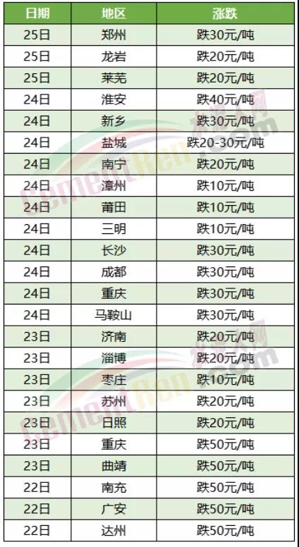川渝地區(qū)大氣污染防控,環(huán)保管制加嚴,加上一些項目因資金緊張,水泥市場需求低迷。各企業(yè)庫存高位運行。同時遭遇外來低價水泥沖擊,競爭加劇。區(qū)域主要品牌企業(yè)陸續(xù)通知下調(diào)水泥價格,其中重慶、達州、廣安、南充以及云南曲靖等多地水泥價格跌50-80元/噸。重慶區(qū)域23、24日連續(xù)兩次下調(diào)水泥價格,累計下跌50-80元/噸,絕大多數(shù)企業(yè)下調(diào)金額在20-30元/噸之間。