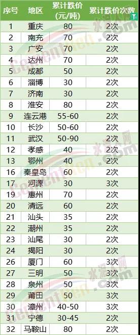 四川南充、廣安、達(dá)州、成都;山東淄博、濟(jì)南;江蘇淮安、連云港;湖北武漢、孝感、鄂州;廣東河源、惠州、清遠(yuǎn)、汕頭、潮州、汕尾、揭陽(yáng);福建廈門、三明、泉州、莆田、漳州、寧德;安徽馬鞍山、河北秦皇島、湖南長(zhǎng)沙以及重慶地區(qū)28個(gè)城市連續(xù)2-3輪下調(diào)水泥報(bào)價(jià),累計(jì)跌價(jià)30-80元/噸。