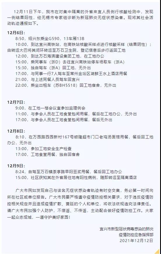 日前 ,江蘇宜興市通報(bào)發(fā)現(xiàn)一例新冠肺炎無癥狀感染者。通報(bào)顯示,該感染者6日從浙江紹興到宜興,期間在萬石海濱建設(shè)集團(tuán)工地等區(qū)域活動,從其活動軌跡可見,該感染者曾參加監(jiān)理例會和工地安全生產(chǎn)檢查。經(jīng)排查,密切接觸者共63人,次密切接觸者共560人。全部集中隔離并規(guī)范開展核酸檢測,已出結(jié)果均為陰性。