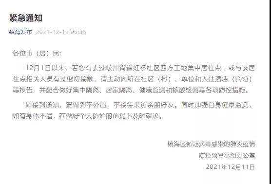 繼江蘇宜興之后,浙江寧波同一工地13人確診。浙江寧波鎮(zhèn)海區(qū)發(fā)布緊急通知,要求自12月1日以來,有去過蛟川街道虹橋社區(qū)四方工地集中居住點(diǎn),或與該居住點(diǎn)相關(guān)人員有過密切接角的人員主動向所在社區(qū)(村)、單位和入住酒店(賓館)等報(bào)告 。