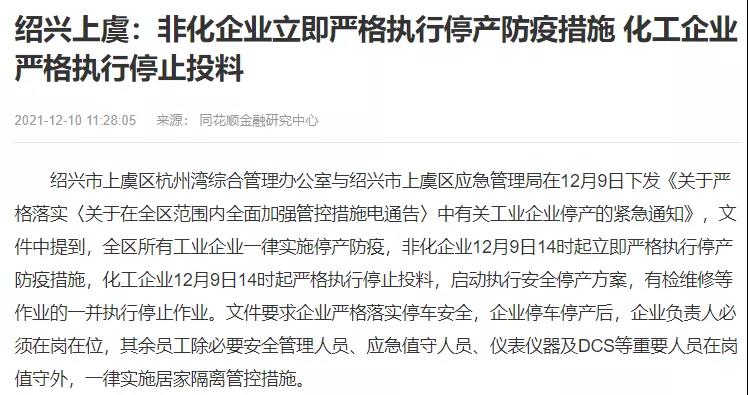 全區(qū)所有工業(yè)企業(yè)一律實(shí)施停產(chǎn)防疫,非化企業(yè)12月9日14時(shí)起立即嚴(yán)格執(zhí)行停產(chǎn)防疫措施,化工企業(yè)12月9日14時(shí)起嚴(yán)格執(zhí)行停止投料,啟動執(zhí)行安全停產(chǎn)方案,有檢維修等作業(yè)的一并執(zhí)行停止作業(yè)。
