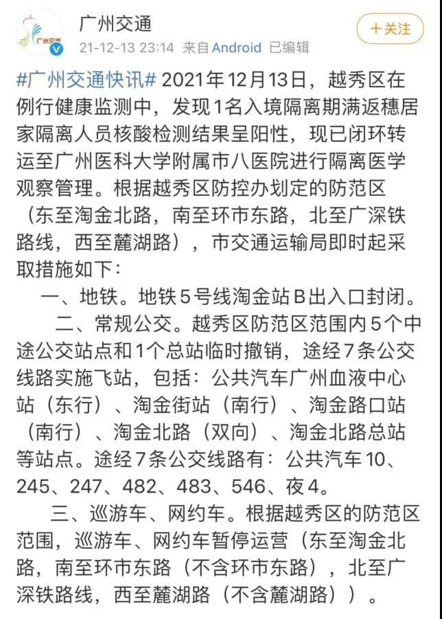 廣州越秀區(qū)部分區(qū)域公共交通暫停服務(wù)。根據(jù)越秀區(qū)防控辦劃定的防范區(qū)(東至淘金北路,南至環(huán)市東路,北至廣深鐵路線,西至麓湖路),廣州市交通運(yùn)輸局即時(shí)起采取措施如下: