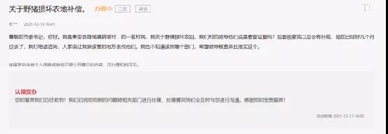 秦安縣隴城鎮(zhèn)陰坡村的一名村民留言稱,野豬損壞農(nóng)田后村的領(lǐng)導(dǎo)說要留證據(jù),視察完以后會(huì)有補(bǔ)貼,現(xiàn)在已經(jīng)好幾個(gè)月過去了,讓到該管的地方去找他們。村民也不知道該找哪個(gè)部門,希望領(lǐng)導(dǎo)核查并且落實(shí)這個(gè)。