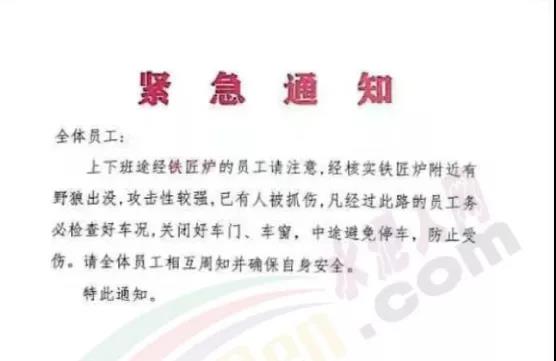 在內(nèi)蒙古草原地區(qū),一家水泥企業(yè)曾發(fā)緊急通知提示上下班途經(jīng)有狼出沒路段的的員工需注意躲避野狼,務(wù)必檢查好車況,關(guān)閉好車門、車窗,中途避免停車,防止受傷。