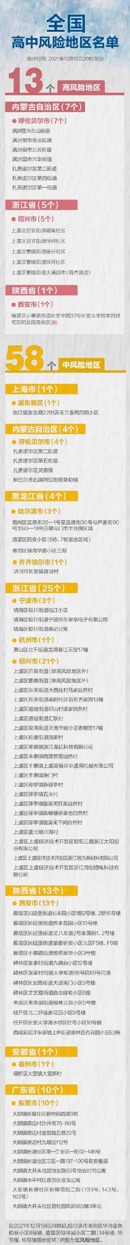 國(guó)家衛(wèi)健委20日通報(bào):12月19日0時(shí)至24時(shí),31個(gè)?。ㄗ灾螀^(qū)、直轄市)和新疆生產(chǎn)建設(shè)兵團(tuán)報(bào)告新增新冠肺炎確診病例102例,其中本土病例37例(陜西24例,其中西安市21例、延安市2例、咸陽市1例;浙江10例,其中紹興市9例、杭州市1例;廣東2例,均在東莞市;北京1例,在通州區(qū))。新增無癥狀感染者33例,其中本土2例(云南1例,在德宏傣族景頗族自治州;陜西1例,在西安市)。目前,全國(guó)有高風(fēng)險(xiǎn)地區(qū)13個(gè),中風(fēng)險(xiǎn)地區(qū)58個(gè)。