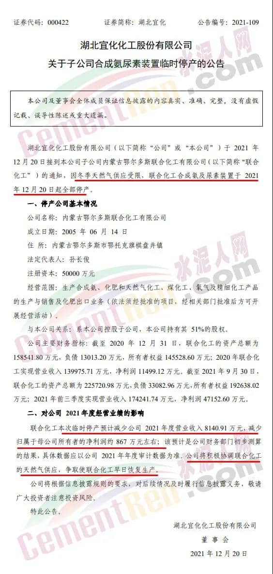 近日,國內化肥巨頭湖北宜化集團發(fā)布公告稱,于2021年12月20日接到其子公司內蒙古鄂爾多斯聯(lián)合化工有限公司的通知,因冬季天然氣供應受限,聯(lián)合化工合成氨及尿素裝置于2021年12月20日起全部停產。