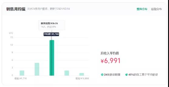 銷售崗位24條用戶薪資,月收平均值為6991元,最高16900元/月,最低1716元/月,45%的員工薪資高于平均水平。擁有3年經(jīng)驗(yàn)的商務(wù)經(jīng)理月薪為16900元,1年以下經(jīng)驗(yàn)的普遍銷售員月薪1716-2700元。擁有1年以上經(jīng)驗(yàn)的銷售員月薪在5300元左右。