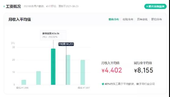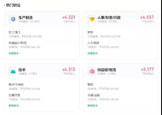 其中月薪最高7807元,最低1056元,熱門(mén)職位中生產(chǎn)制造平均月收入為4321元,供應(yīng)鏈/物流為5177元。擁有2年經(jīng)驗(yàn)的生產(chǎn)操作員,月薪7807元,無(wú)經(jīng)驗(yàn)的普工操作工月薪1500元。
