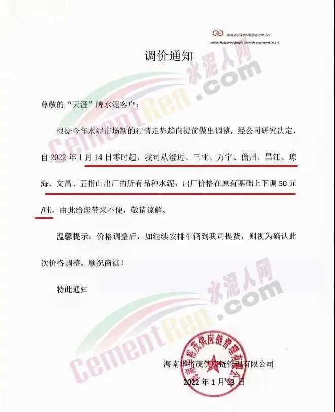 1月13日海南華裕茂供應(yīng)鏈管理有限公司通知,根據(jù)今年水泥市場新的行情走勢趨向提前做出調(diào)整。經(jīng)公司研究決定,自2022年1月14日零時起,從澄邁、三亞、萬寧、儋州、昌江、瓊海、文昌、五指山出廠的所有品種水泥,出廠價格在原有基礎(chǔ)上下調(diào)50元/噸。