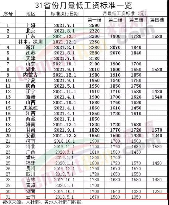 ?從上述數(shù)據(jù)可見,云南區(qū)域最低工資標(biāo)準位于全國31省市自治區(qū)最低工資標(biāo)準的最后一位。