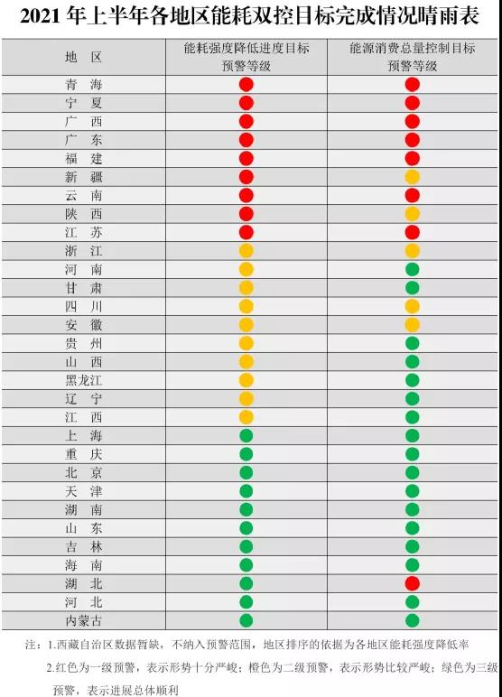 國家發(fā)展改革委印發(fā)《2021年上半年各地區(qū)能耗雙控目標(biāo)完成情況晴雨表》。青海、寧夏、廣西、廣東、福建、新疆、云南、陜西、江蘇、浙江、安徽、四川等12個(gè)地區(qū)在能耗降低和能源消費(fèi)總量方面均呈現(xiàn)嚴(yán)峻態(tài)勢。全國有一半以上的省份,上半年“雙控”目標(biāo)都沒完成,多區(qū)域采取最嚴(yán)格的限產(chǎn)、限電措施。