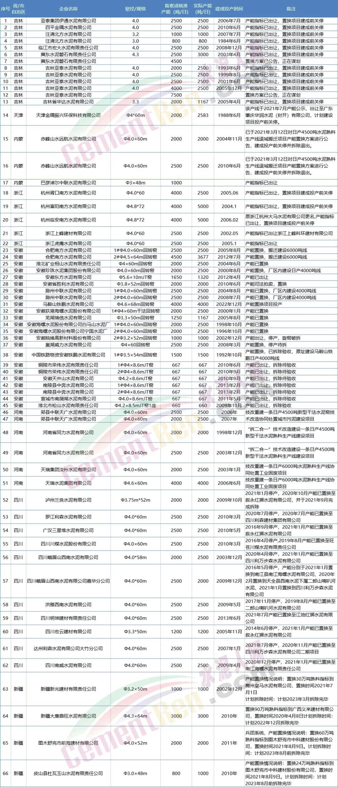近日吉林、天津、內(nèi)蒙、浙江、安徽、山東 、河南、四川、云南、新疆、寧夏等多個(gè)省市自治區(qū)公布了截止2021年底水泥熟料生產(chǎn)線清單,其中明確提到各區(qū)域產(chǎn)能置換退出生產(chǎn)線清單。據(jù)不完全統(tǒng)計(jì)合計(jì)退出66條生產(chǎn)線,合計(jì)產(chǎn)能達(dá)4465.86萬(wàn)噸/年。