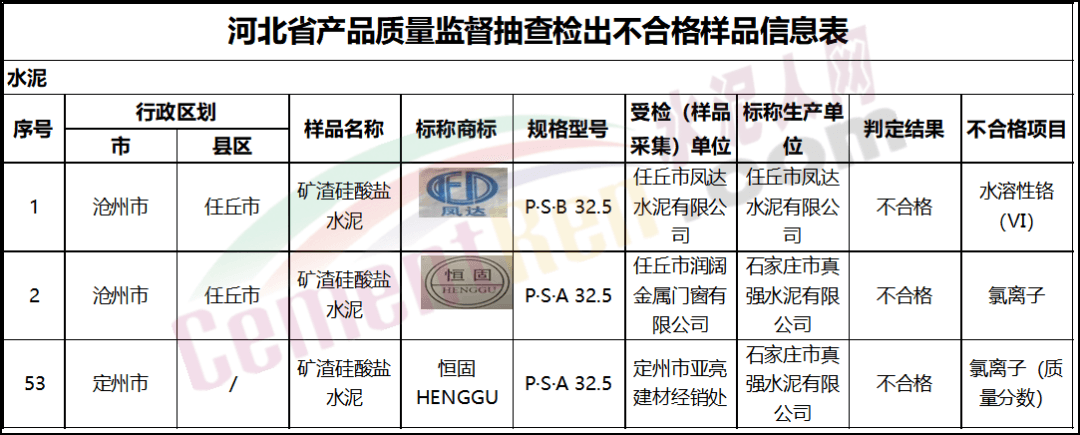 河北省市場監(jiān)管局抽查水泥產(chǎn)品檢出不合格樣品3批次。 不合格項目分別為水溶性鉻(VI)、氯離子以及氯離子(質(zhì)量分數(shù))。