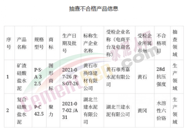 湖北省市場監(jiān)管局通報兩個批次水泥產(chǎn)品不合格,不合格項目為28天抗壓強度、水溶性六價鉻。