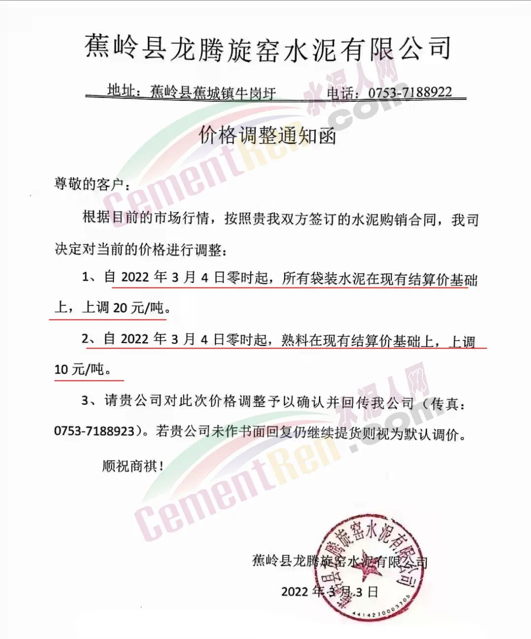 蕉嶺縣龍騰旋窯水泥有限公司通知,根據(jù)目前的市場行情,決定對當(dāng)前的價(jià)格進(jìn)行調(diào)整。自2022年3月4日零時(shí)起,所有袋裝水泥在現(xiàn)有結(jié)算價(jià)基礎(chǔ)上上調(diào)20元/噸,熟料在現(xiàn)有結(jié)算價(jià)基礎(chǔ)上上調(diào)10元/噸。