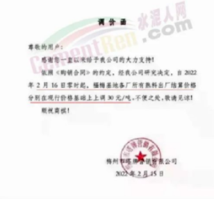梅州寧江水泥有限公司銷售部通知,經(jīng)公司研究決定并授權(quán)銷售部發(fā)出通知,從2022年3月4日零時(shí)起,本公司生產(chǎn)的所有袋裝水泥,出廠價(jià)格在現(xiàn)行價(jià)格基礎(chǔ)上上調(diào)20元/噸。