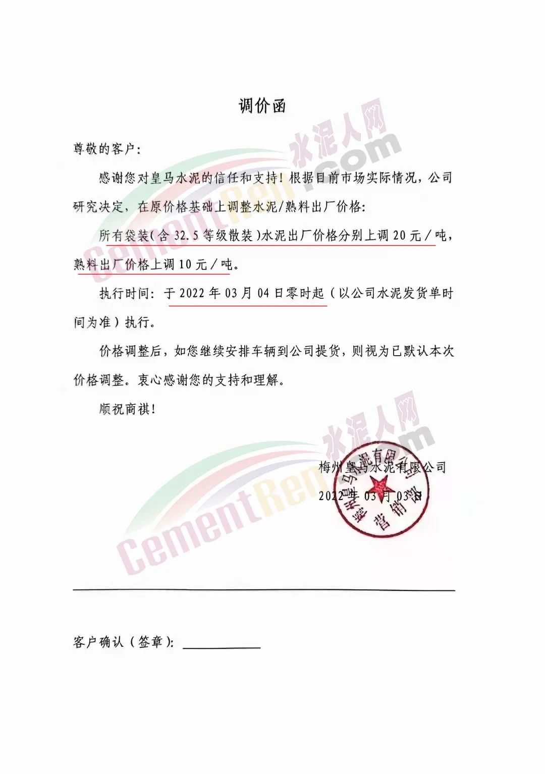 梅州皇馬水泥有限公司通知,根據(jù)目前市場實(shí)際情況,公司研究決定,自2022年3月4日零時(shí)起所有袋裝(含32.5等級散裝)水泥出廠價(jià)格分別上調(diào) 20元/噸,熟料出廠價(jià)格上調(diào)10元/噸。