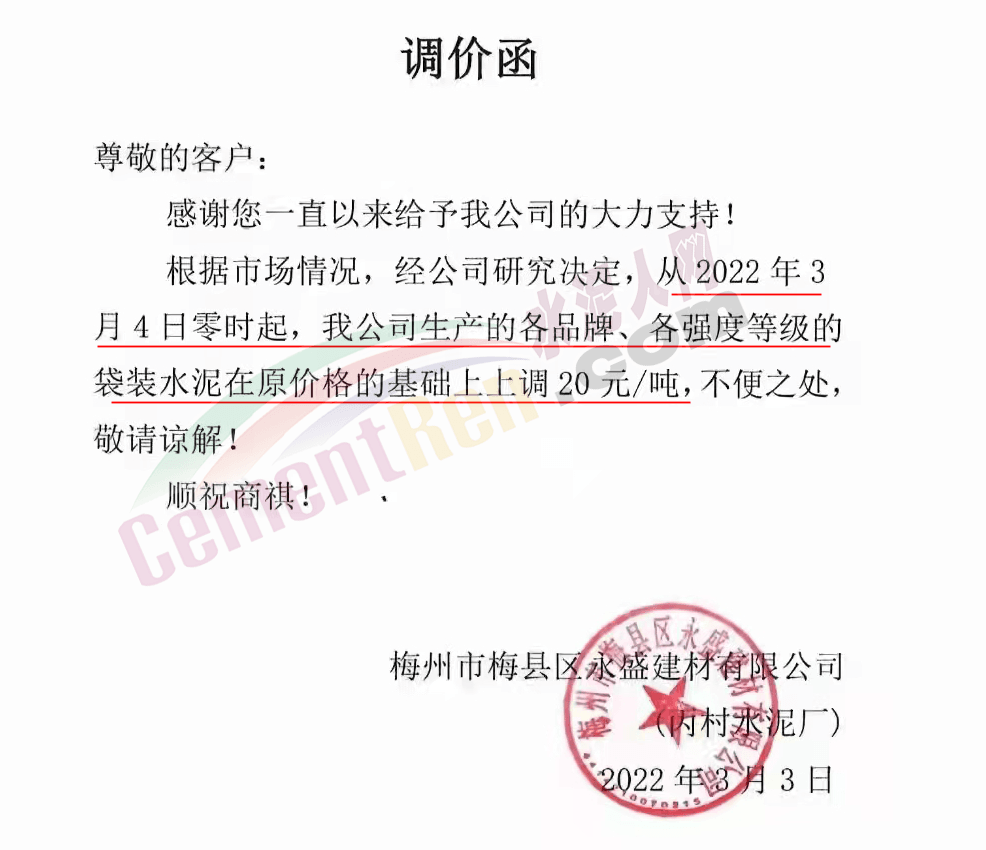 梅州市梅縣區(qū)永盛建材有限公司通知,從2022年3月4日零時(shí)起,公司生產(chǎn)的各品牌、各強(qiáng)度等級的袋裝水泥在原價(jià)格的基礎(chǔ)上上調(diào)20元/噸。