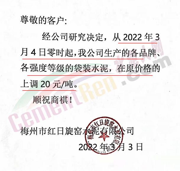 梅州市紅日旋窯水泥有限公司通知從2022年3 月4日零時(shí)起,各品牌、各強(qiáng)度等級的袋裝水泥,在原價(jià)格的上調(diào) 20元/噸。