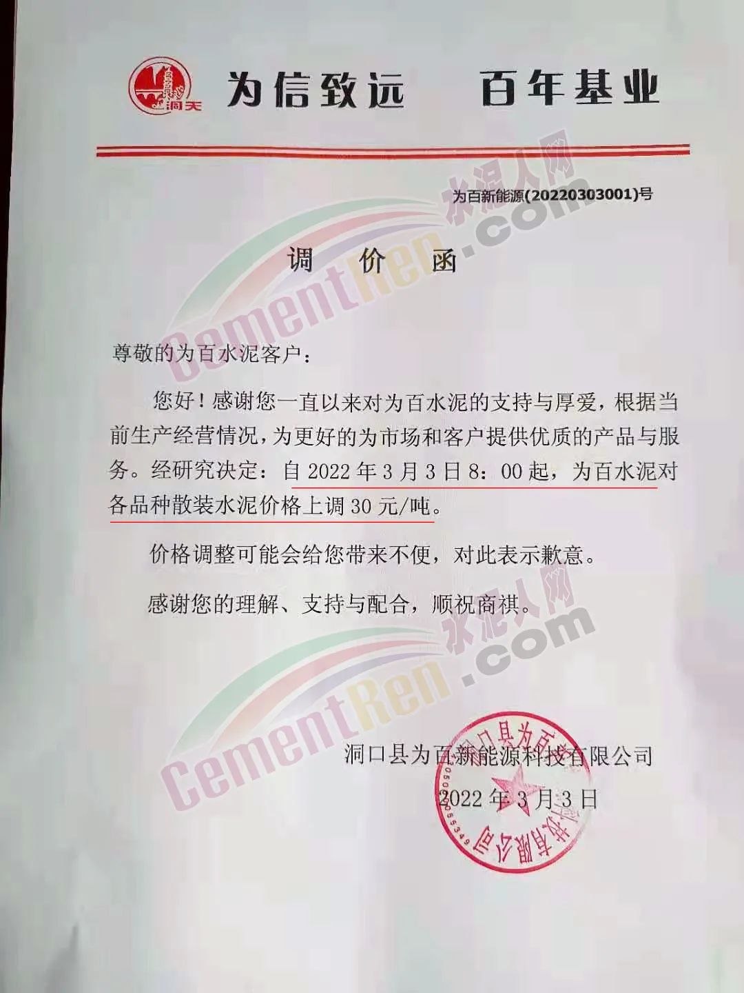 湖南省邵陽市洞口縣為百新能源料技有限公司通知,根據(jù)當(dāng)前生產(chǎn)經(jīng)營情況,為更好的為市場和客戶提供優(yōu)質(zhì)的產(chǎn)品與服務(wù)。經(jīng)研究決定自 2022年3月3日8時(shí)起,為百水泥對各品種散裝水泥價(jià)格上調(diào)30元/噸。