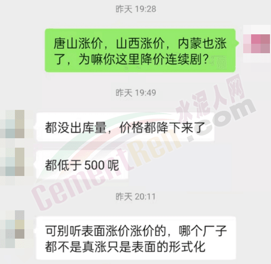 保定區(qū)域一建材貿(mào)易商對水泥人網(wǎng)表示,目前河北保定區(qū)域多數(shù)企業(yè)都沒有出庫量,價(jià)格都降下來了,P.O42.5散裝水泥報(bào)價(jià)多在500元/噸以下。“可別聽表面上漲價(jià)的,那些都不是真漲,只是表面的形式化”。上述貿(mào)易商對水泥人網(wǎng)表示,已經(jīng)有企業(yè)開始降價(jià)了,啥時(shí)候能止跌還不確定,但是降價(jià)很有可能“拍成連續(xù)劇”。