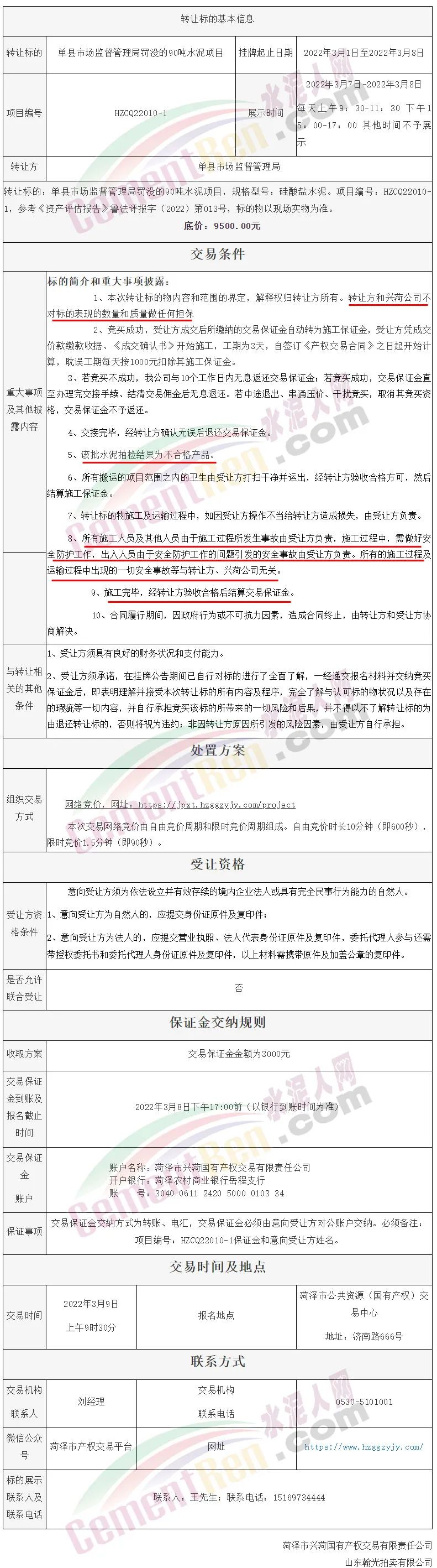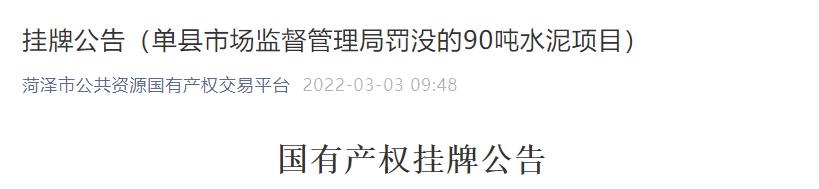 ?日前菏澤市公共資源國有產(chǎn)權交易平臺發(fā)布的一則《國有產(chǎn)權掛牌公告》的顯示,將于2022年3月1日至2022年3月8日掛牌轉(zhuǎn)讓標的為單縣市場監(jiān)督管理局罰沒的90噸硅酸鹽水泥,底價為9500元 。重大事項及其他披露內(nèi)容中明確“該批水泥抽檢結(jié)果為不合格產(chǎn)品。”